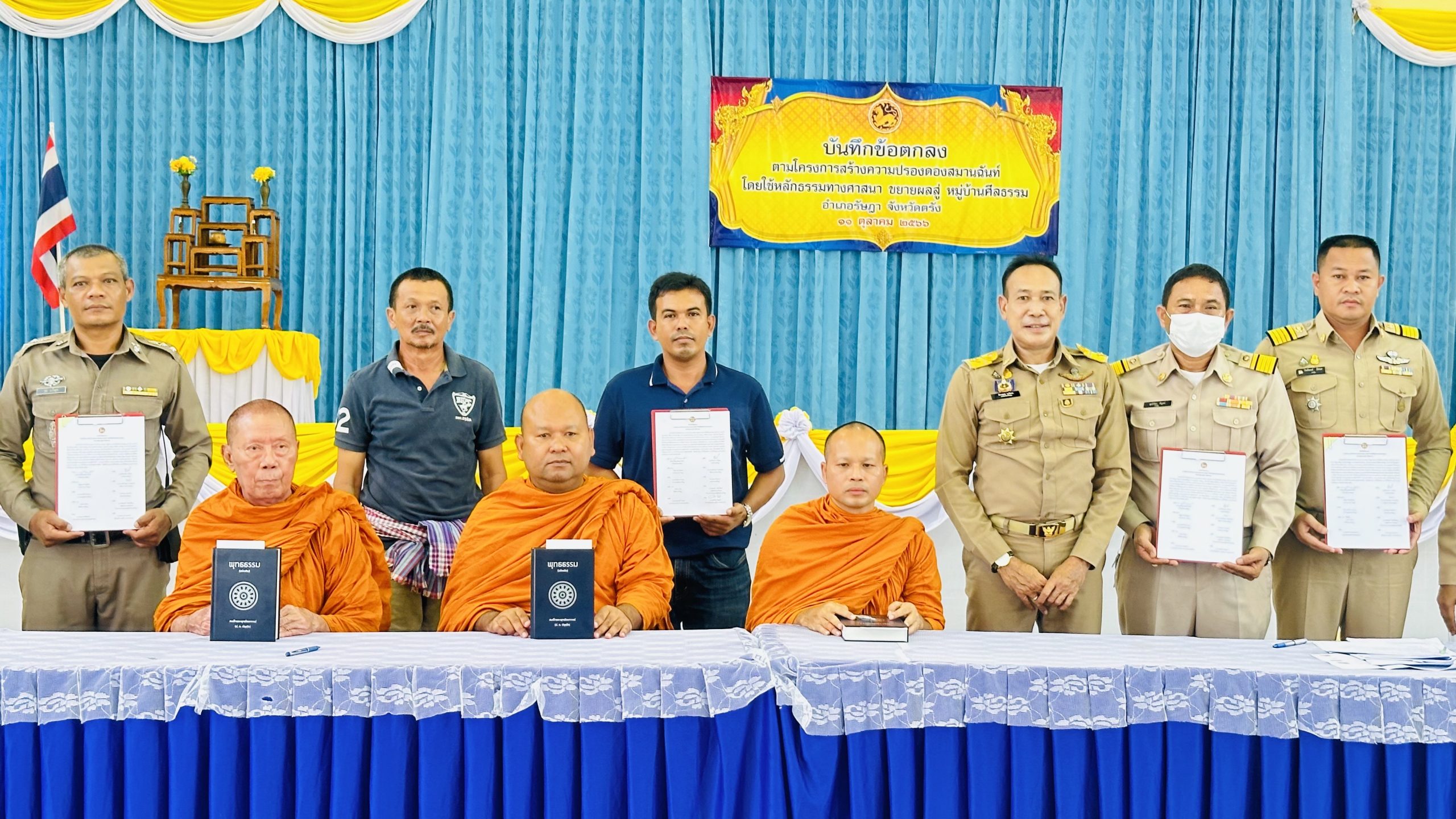 วันพุธที่ 11 ตุลาคม 2566 เวลา 09.30 น. พ.ต.ท.วุฒิ แก้วสุข สวป.สภ.รัษฎา ร่วมประชุมการขับเคลื่อนโครงการสร้างความปรองดองสมานฉันท์ โดยใช้หลักทางศาสนาขยายผลสู่หมู่บ้านศีลธรรม อำเภอรัษฎา จังหวัดตรัง โดยมี นายธีระยุทธ นาวีเดล นายอำเภอรัษฎา เป็นประธานการประชุมและร่วมลงนามบันทึกข้อตกลงตามโครงการฯ
