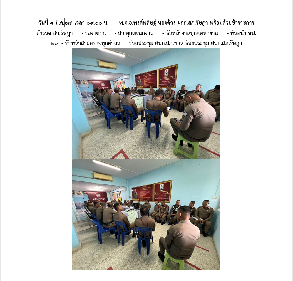 8 มี.ค.67 เวลา 09.00 น. พ.ต.อ.พงศ์พสิษฐ์ ทองด้วง ผกก.สภ.รัษฎา พร้อมด้วยข้าราชการตำรวจ สภ.รัษฎา – รอง ผกก. – สว.ทุกแผนกงาน – หัวหน้างานทุกแผนกงาน – หัวหน้า ชป.20 – หัวหน้าสายตรวจทุกตำบล ร่วมประชุม ศปก.สภ.ฯ ณ ห้องประชุม ศปก.สภ.รัษฎา