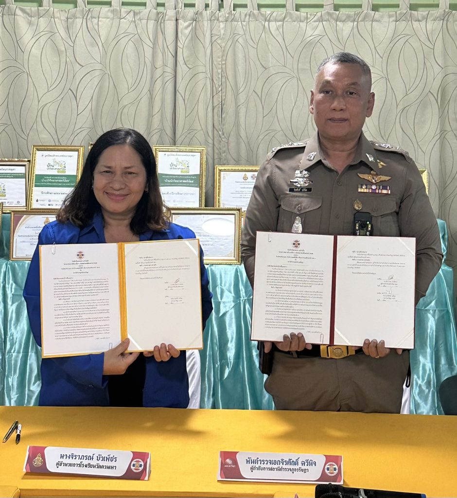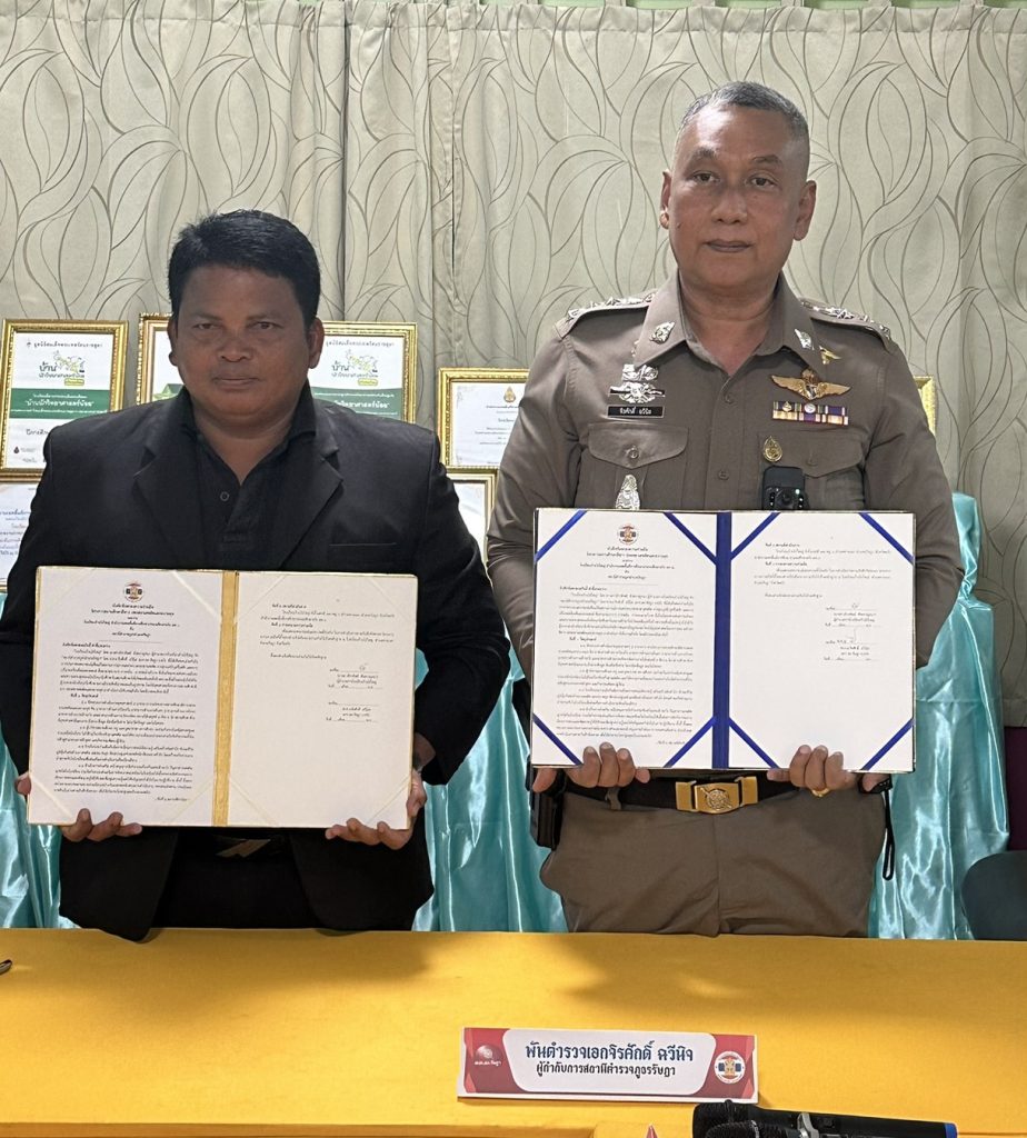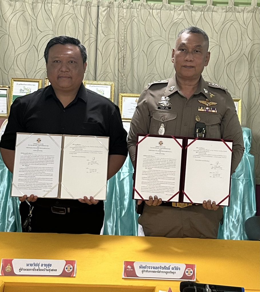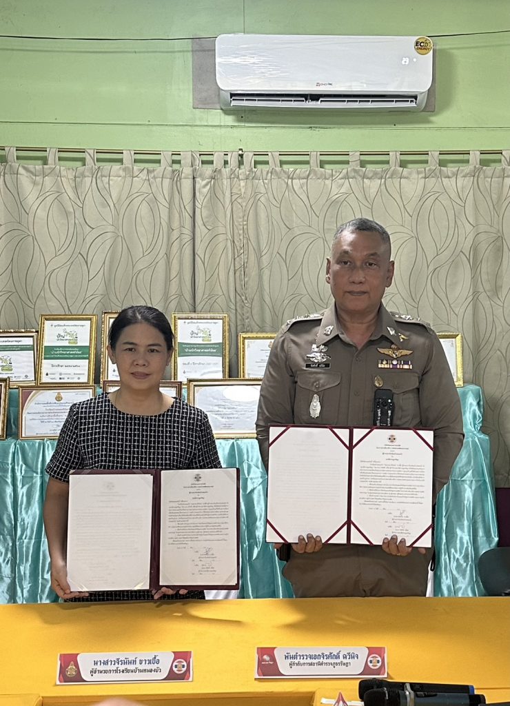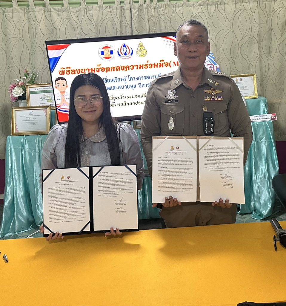 พ.ต.อ.จิรศักดิ์ ฉวีนิล ผกก.สภ.รัษฎา พ.ต.ท.สนั่น นิลวงศ์ สว.อก.สภ.รัษฎา ร่วมพิธีลงนามบันทึกข้อตกลงความร่วมมือ (MOU)โครงการสถานศึกษาสีขาว ปลอดยาเสพติดและอบายมุขโรงเรียนบ้านหนองศรีจันทร์และภาคีเครือข่ายอำเภอรัษฎา ณ โรงเรียนบ้านหนองศรีจันทร์ หมู่ที่ ๕ ตำบลหนองบัว อำเภอรัษฎา จังหวัดตรัง